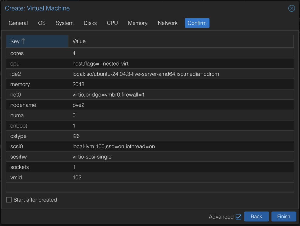 - In CPU tab, make sure Type is set to Host, and nested-virt flag is on.