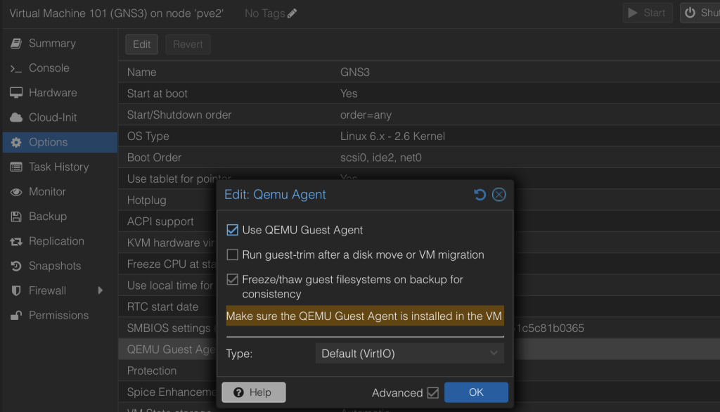Afterwards, make sure it’s enabled in Proxmox (VM’s Options tab)