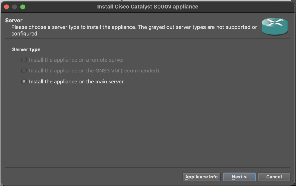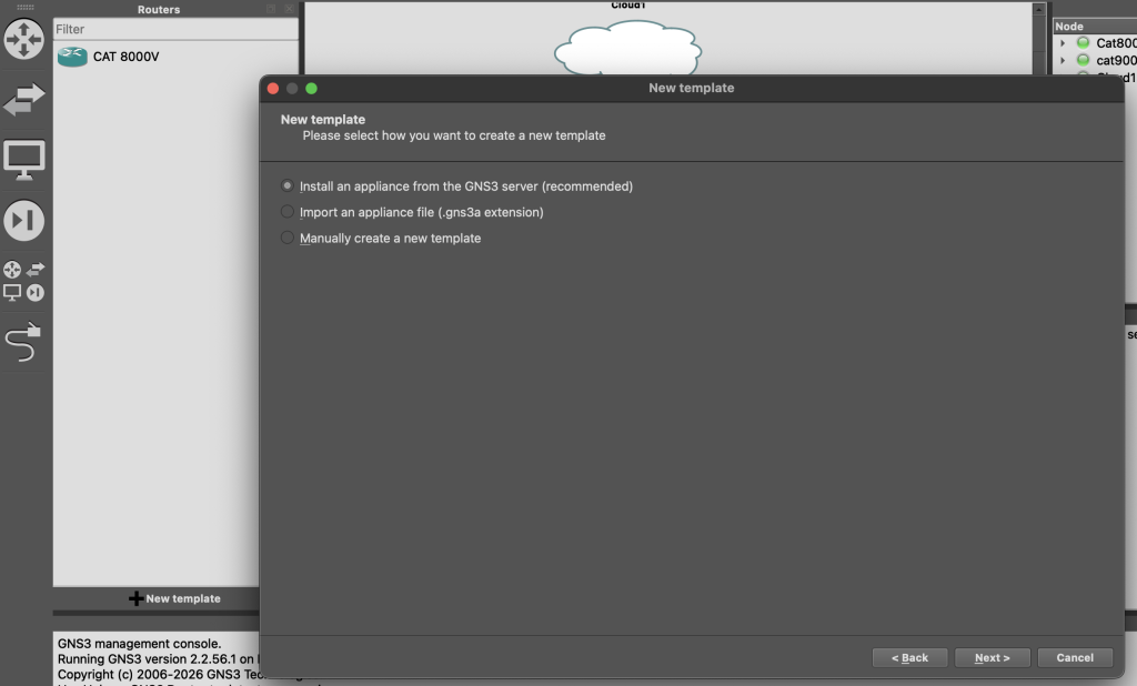 Click on the router icon and then New template and the option to install from the GNS3 server.
