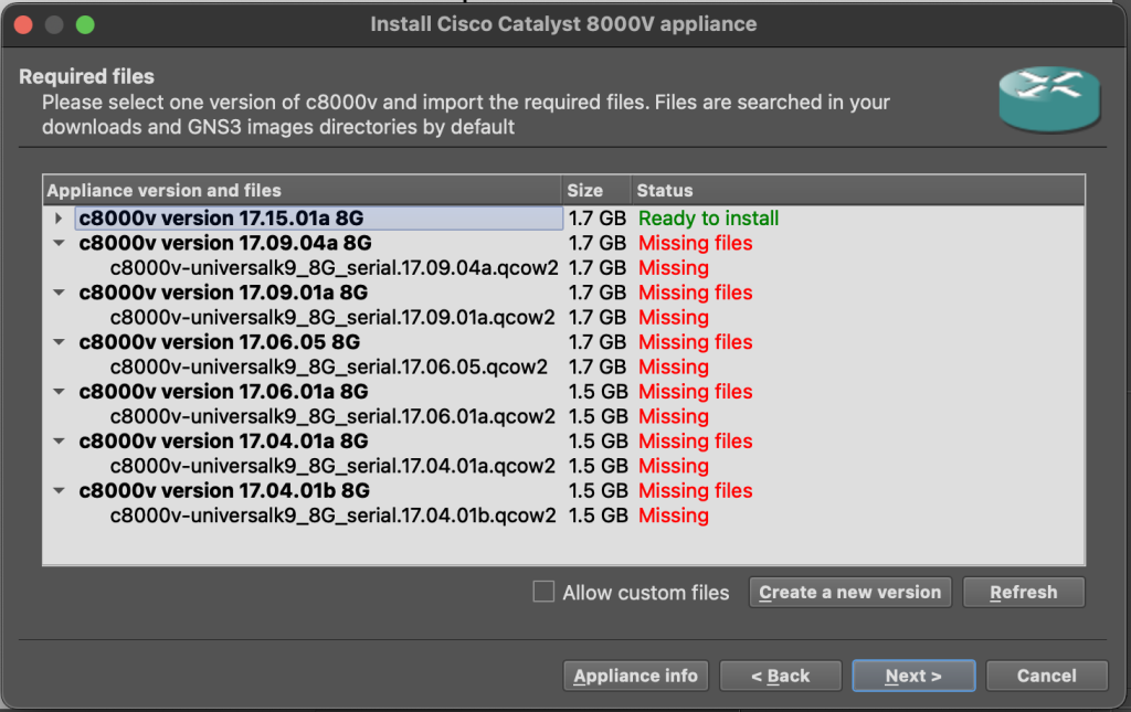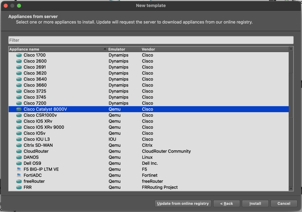 I will select the template for the 8000V router as I want to play with NETCONF and that is one of the least taxing devices to emulate.